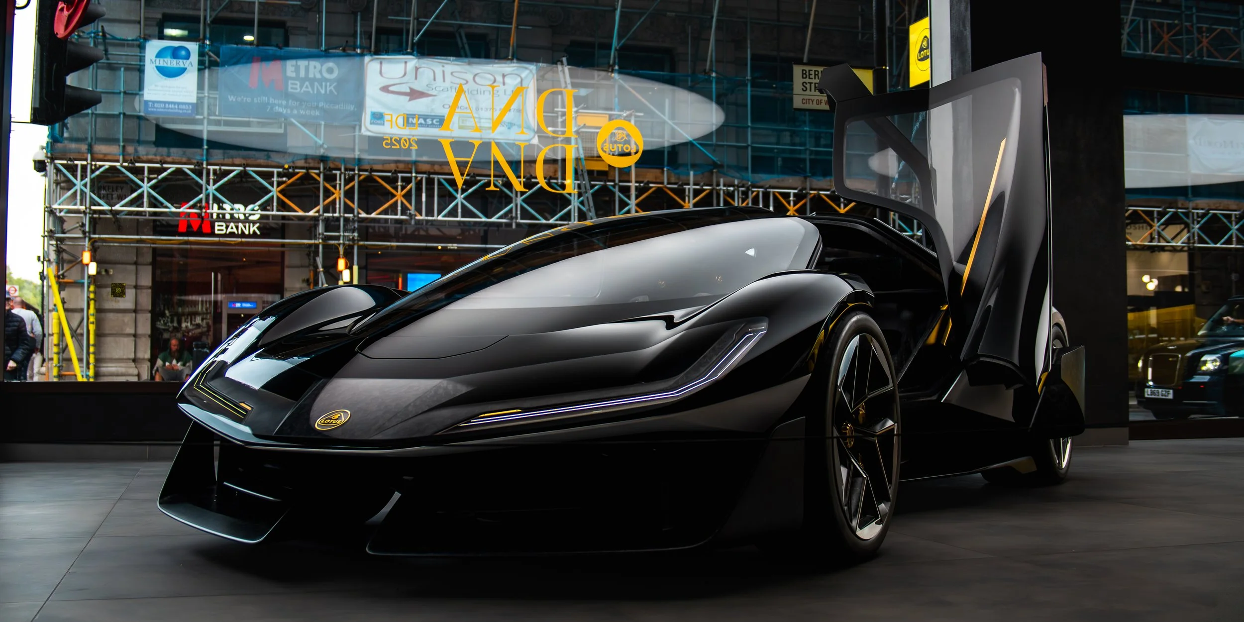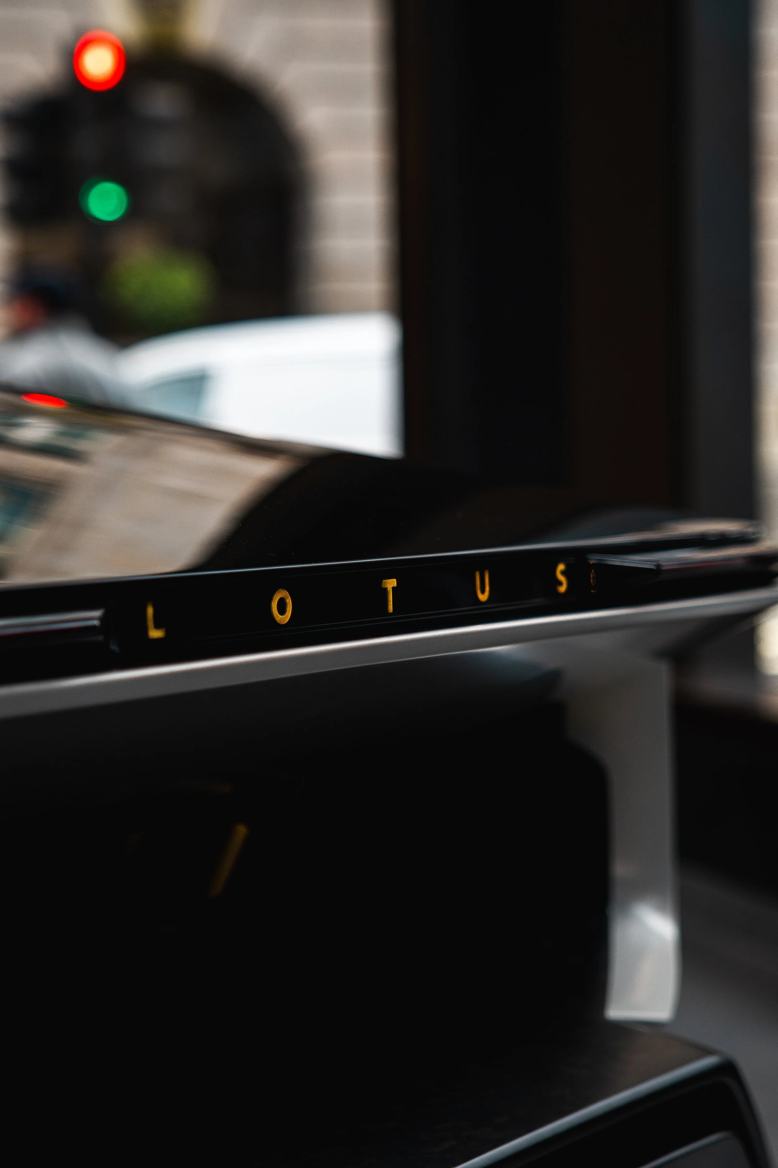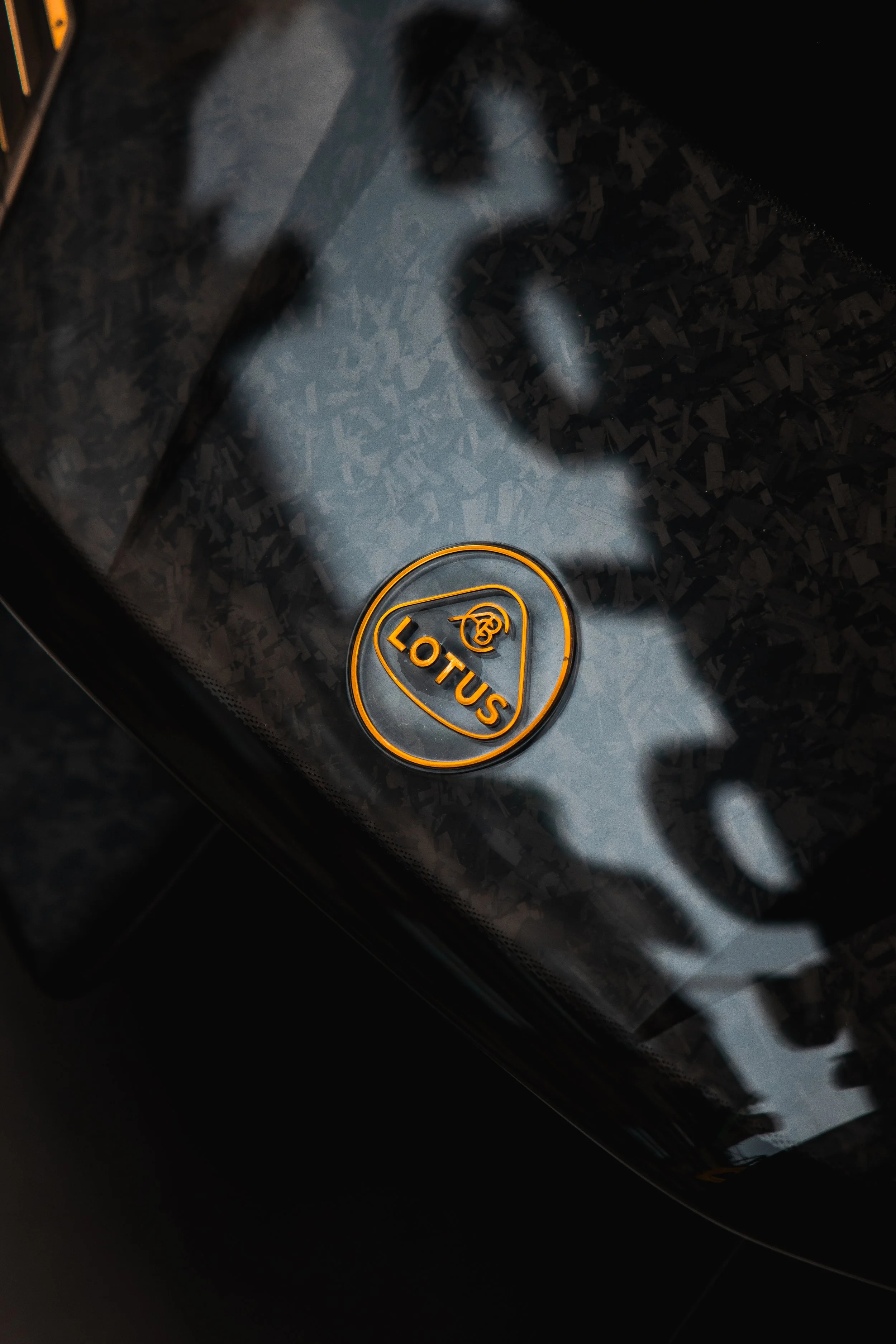 Reflected silhouette of a person on a black surface with an orange Lotus logo.