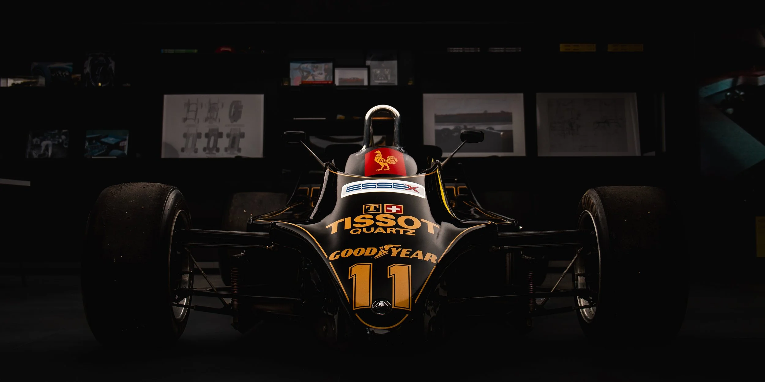A vintage black Formula 1 race car with various sponsor logos, including Tissot and Goodyear, displayed in a dark room, with a red Ferrari emblem on the front of the car's nose and the number 11.